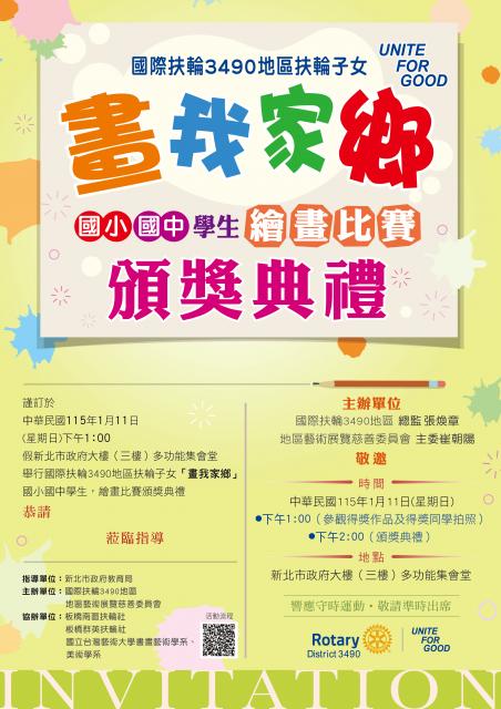 親愛的社友們您好 誠摯邀請您與寶春尊眷及家中子女,一同參加「國際扶輪 3490 地區 扶輪子女畫我家鄉」繪畫比賽頒獎典禮! ▊ 活動時間 115 年 1 月 11 日(星期日)下午 1:00 ▊ 活動地點 新北市政府大樓 3 樓|多功能集會堂 ▊ 典禮內容 • 頒發各組前三名、創作獎、佳作獎 • 得獎作品展覽 • 精彩舞臺表演 • 小朋友專屬精美摸彩活動