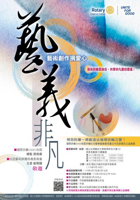 【扶輪社友暨眷屬 繪畫/書法展覽及公益義賣】 扶輪 3490 地區將舉辦社友與眷屬的藝術作品展覽與義賣,義賣所得全數捐助社福團體 捐贈作品者總監於地區年會(或感恩餐會)公開表揚及感謝! ▊ 展覽時間 •115/ 4/7~115/4/12|國立台灣藝術大學真善美藝廊/大觀藝廊 • 115/4/18|新莊頤品大飯店(地區年會會場) • 網路展覽|115/4/7~4/18 ▊