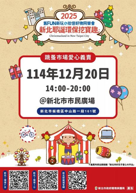 12/20(六)一起在耶誕市集讓愛發光 新北市民廣場 義賣時段:下午 2:00–6:00 挖寶趣攤位號碼20-24 (位置附平面圖) 新北市百合社 24 號/ 泰山社 23號/ 新莊南區社 22號 新北產經社 21號/ 新北和平社 20號 今年活動以 「馬戲團 × 嘉年華」 為主題, 現場將充滿節慶氣氛、色彩繽紛的攤位與滿滿歡笑。 我們扶輪