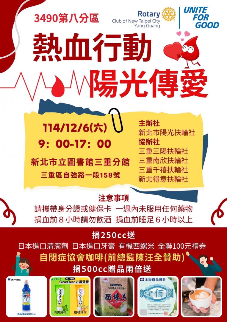 由 新北市陽光扶輪社主辦、三重地區多個扶輪社協辦的年度捐血活動,即將於 新北市立圖書館三重分館 舉行!誠摯邀請大家攜手挽袖,用一袋熱血溫暖更多生命。