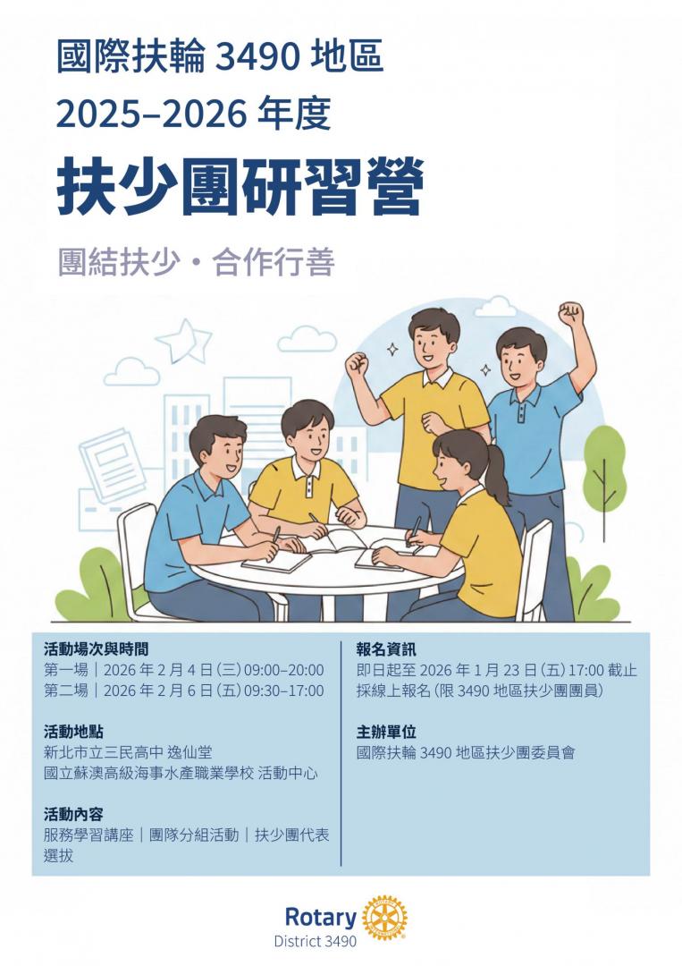 為培養扶少團團員的領導力與服務精神,國際扶輪 3490 地區特別規劃「扶少團研習營」,透過服務學習、團隊合作與實務活動,陪伴青年在學習中成長、在行動中找到自己的力量 。